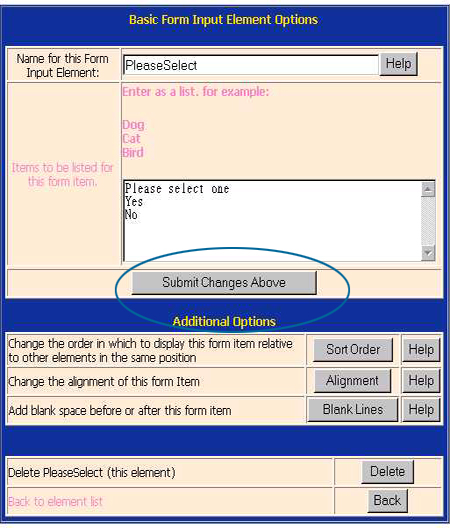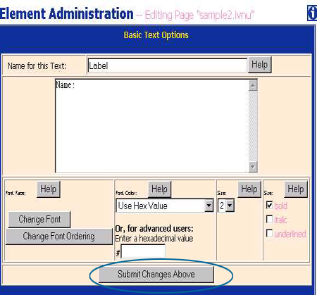 This will take you into a new element administration screen. This is the same screen as used in changing text from earlier in the tutorial. Make your appropiate changes here and click on the "Submit Changes Above" link provided.