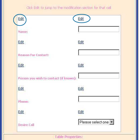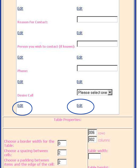 You will be redirected to the Element Administration page for your form. Scroll down that page until you reach the area as outlined below. The forms are made in a table format. In order to change the information or lables of the items on the form, click on the edit link next to the item you want to modify.