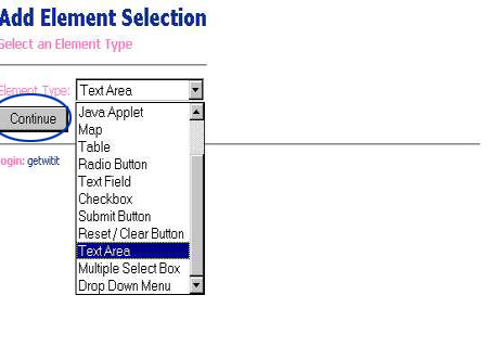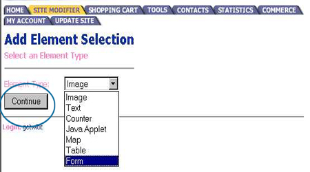 In the Add Element page you will be asked to select an element type. From the pull down menu select Form