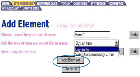 Next you will be prompt to select the type of form you want to add. Buy an Item or Submit information by Email. Once you have made your selection, click on the "Add Element" link. This tutorial is on the Submit Information by Email Form.